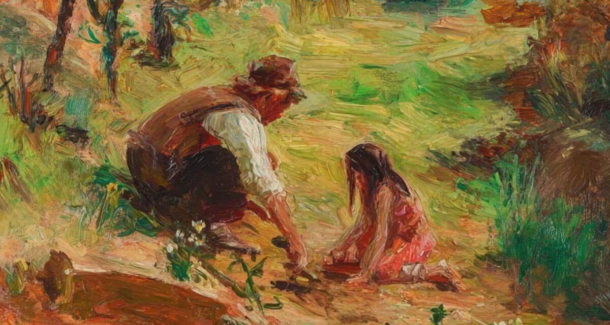 I feel the dirt underneath my fingers. They are sore from the pressure of the scraping, for the dirt has rocks in it, small jagged edges of gray and white. The words stay imprinted on my fingers, and I feel the story. I know the story’s heart beating. I let it push out and through, together — me, her, you, Jesus. All of us speak and sing and point to the story of the beginning.
